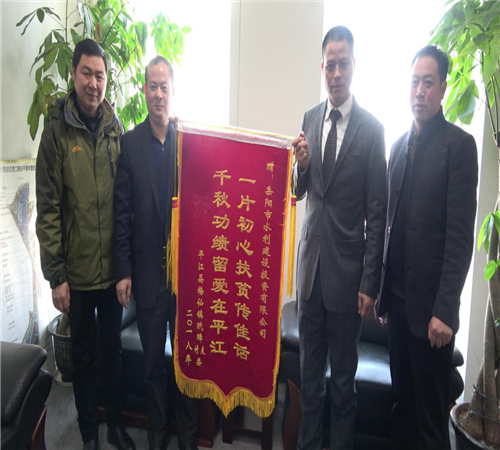 1月22日,平江縣梅仙鎮(zhèn)玳璋村幫扶對(duì)象,將一面寫著"一片初心扶貧傳佳話,千秋功績(jī)留愛(ài)在平江"18個(gè)大字的鮮紅錦旗送到市水建投董事長(zhǎng)劉寶山、總經(jīng)理?xiàng)钚圯x的手中,對(duì)市水建投對(duì)精準(zhǔn)扶貧工作的大力支持表達(dá)誠(chéng)摯謝意。